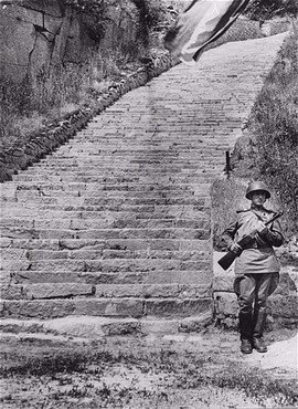 Tentamos avançar devagar, cautelosamente, arrastando-nos pelo chão. Isto nos custou um grande esforço, pois o fogo inimigo acompanhava todos os nossos movimentos. De repente, ouvi um grito às minhas costas. Voltei a cabeça e vi que um dos sargentos, que rastejava atrás de mim, tinha sido ferido no ombro. O homem que ia a seguir agarrou-o pelos quadris e levou-o a um lugar abrigado. Uma chuva de granadas, lançada pelos nossos passou por cima de nós e foi explodir em pontos-chave do inimigo. Tivemos sorte, pois o terreno não era difícil para a progressão; caso contrário, o avanço teria sido dificílimo. Um dos nossos homens, que avançava na frente, lançou um gemido. Logo, voltou a cabeça e gritou: